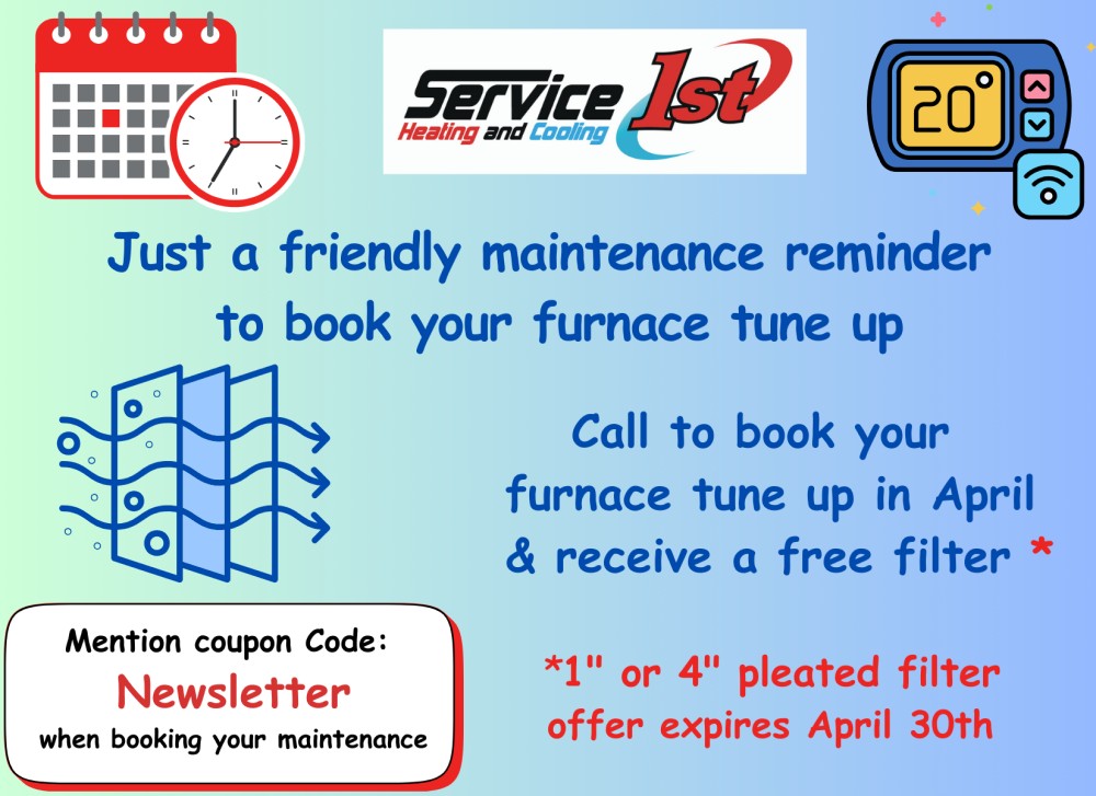 Call us now to book your furnace tune up and receive a free 1” or 4” pleated filter.